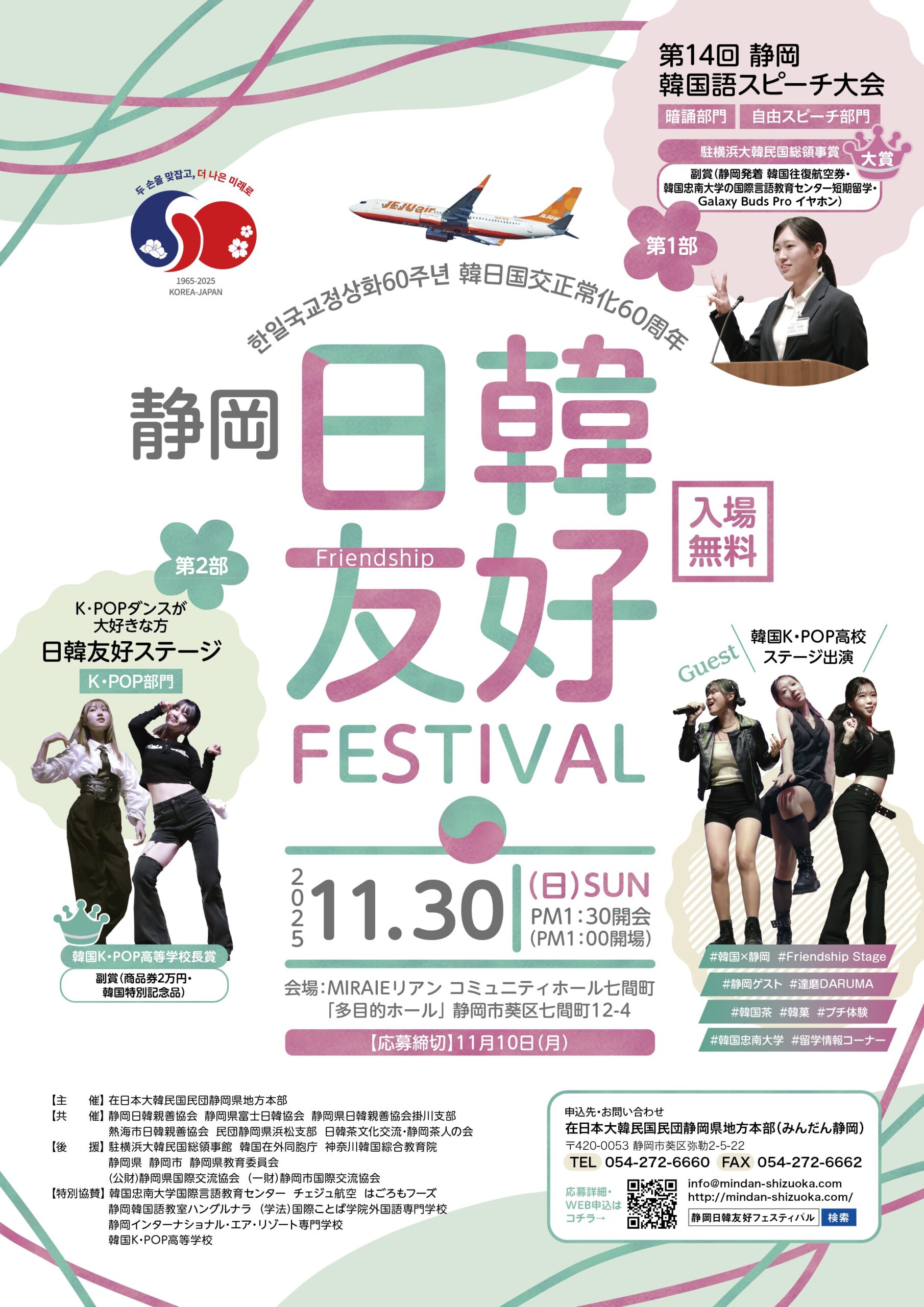 このたび、幣民団は韓日間の友好的な交流の活性化と相互理解の促進を図ることを目的とし、『韓日国交正常化60周年 静岡日韓友好Festival2025』を開催致します。